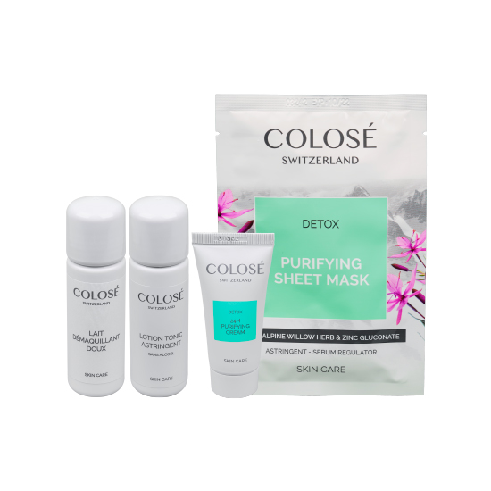 Reinigungsmilch (40 ml), Gesichtswasser (40 ml), Detox-Creme (15 ml) und Detox-Tuchmaske.